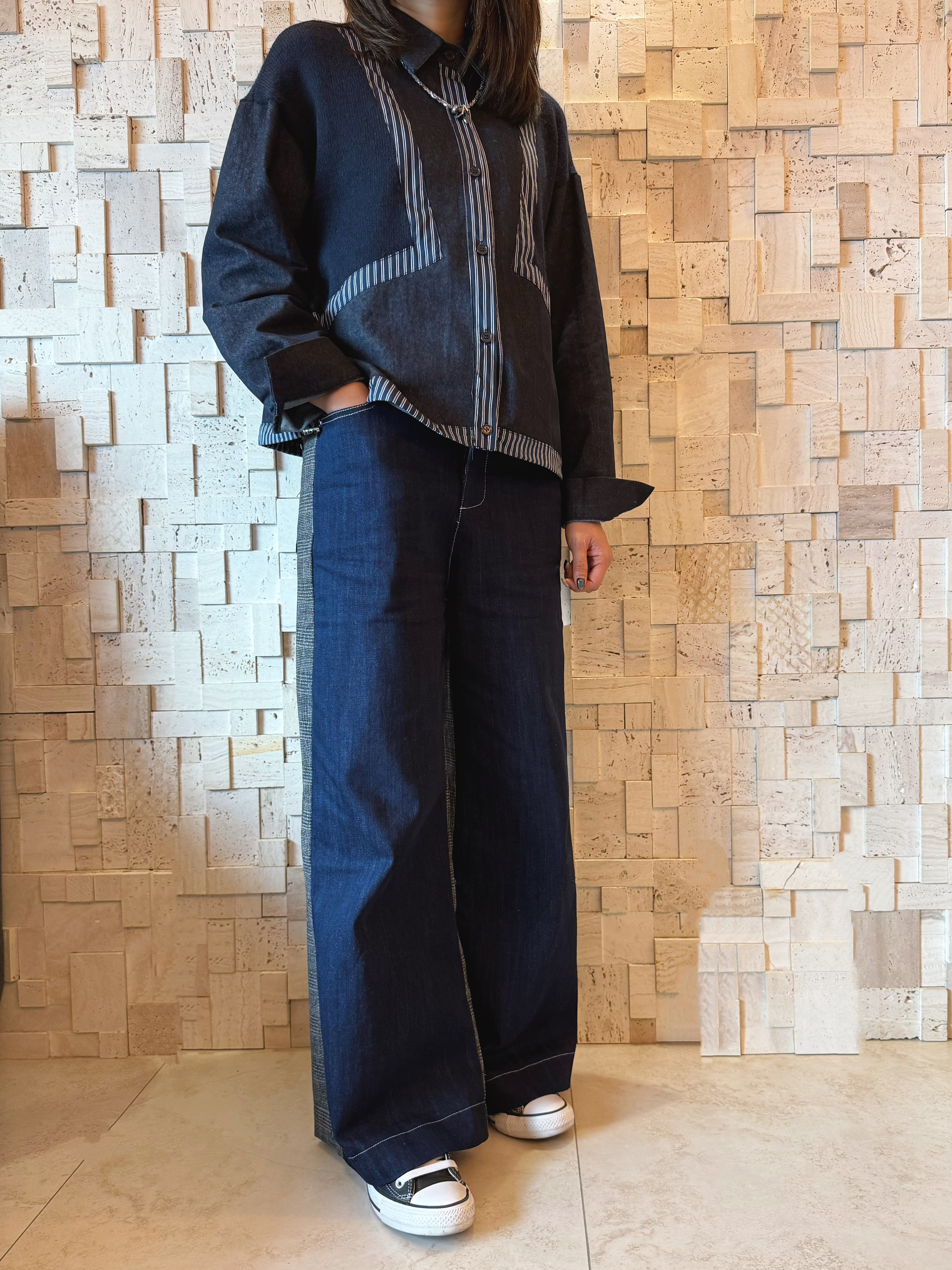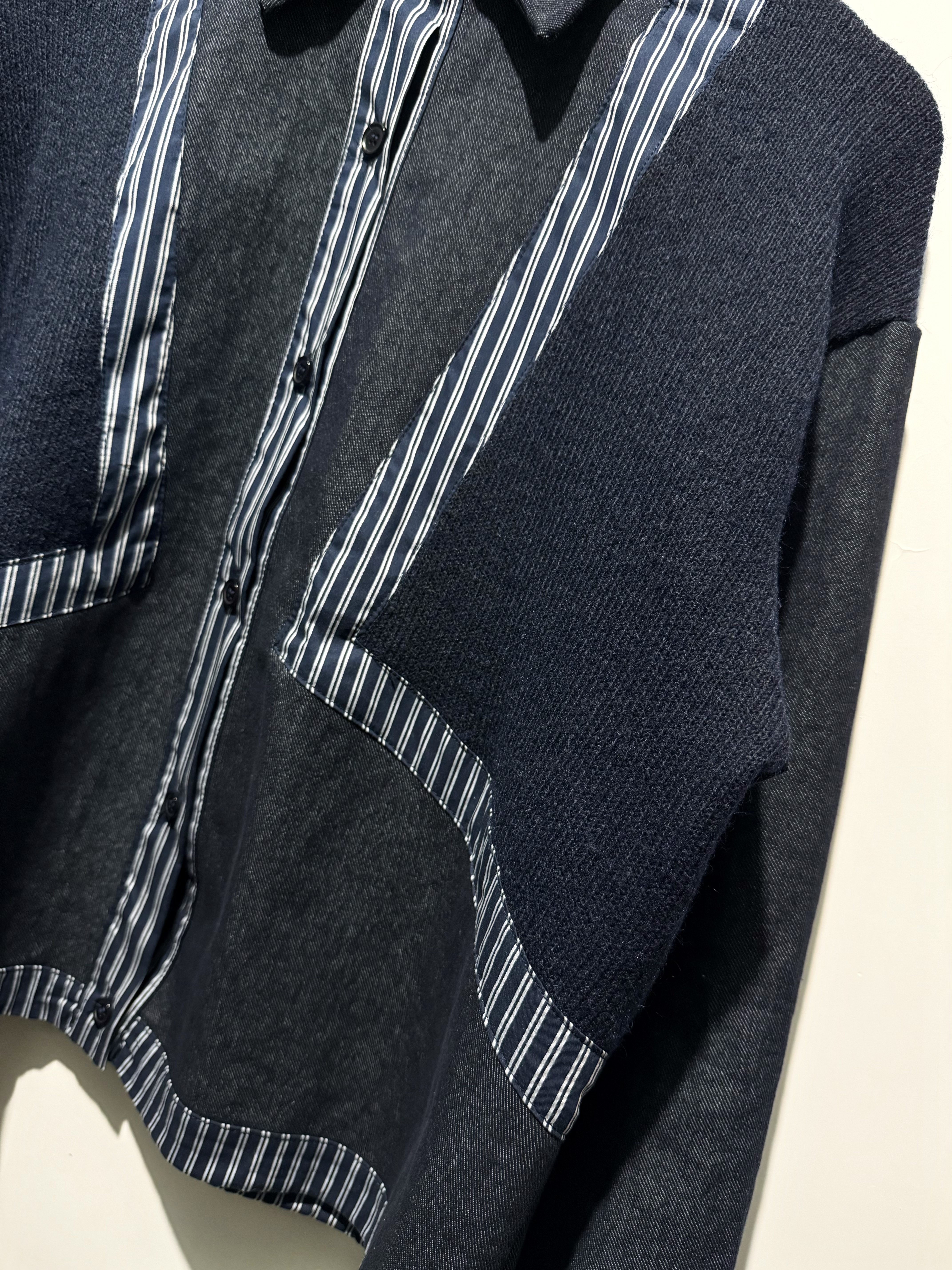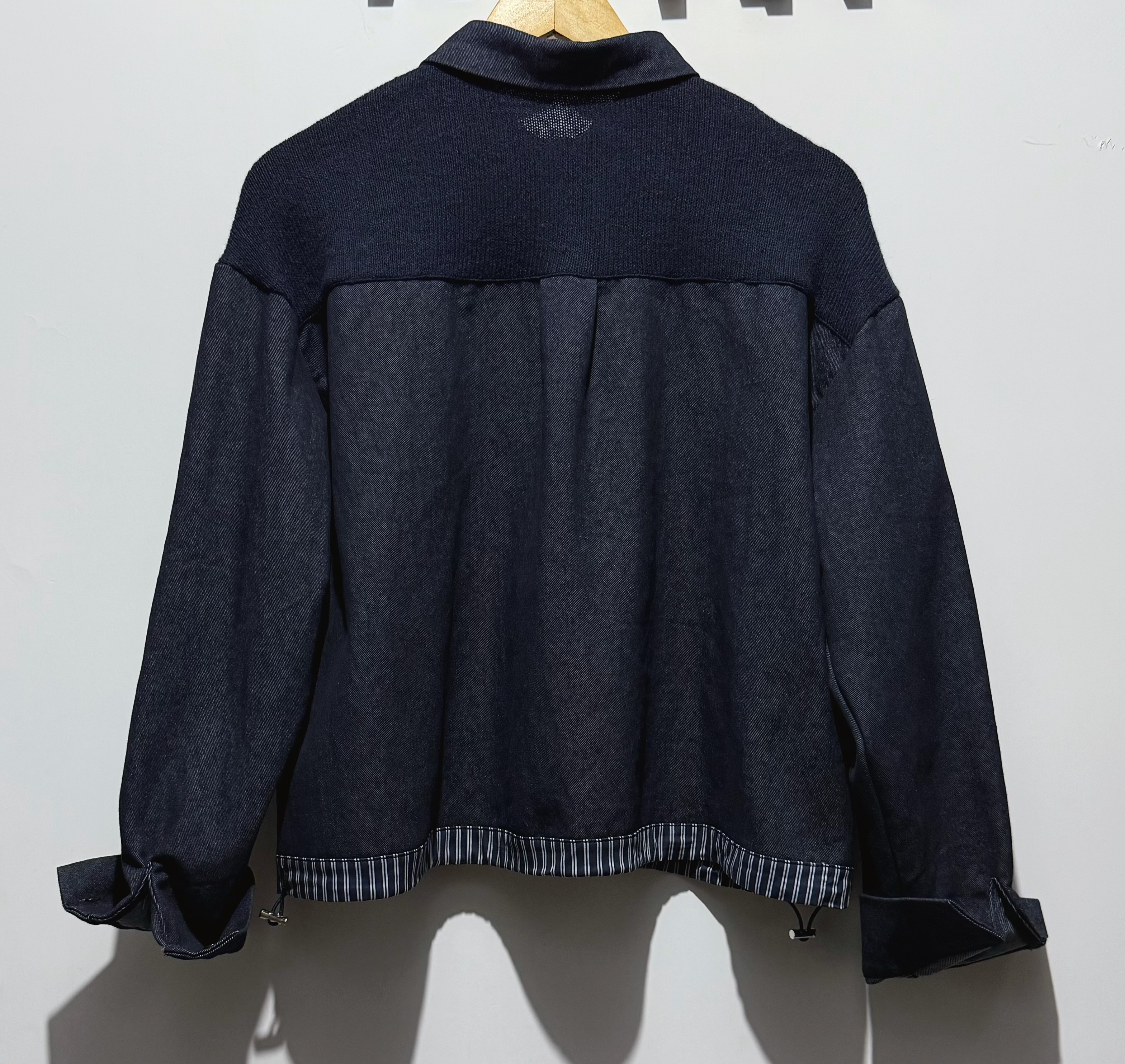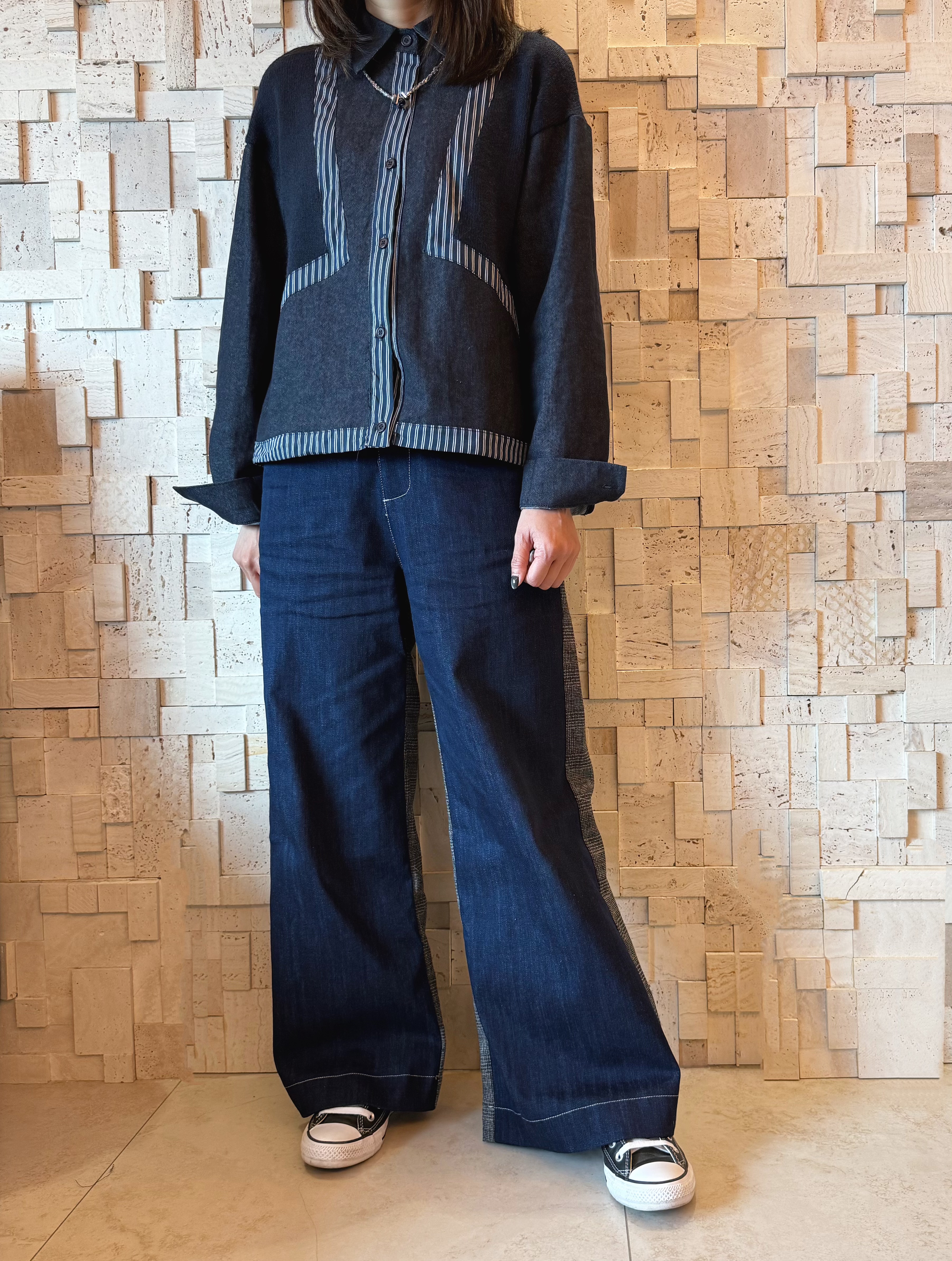 呢件我一見到就超鐘意 用咗三種唔同物料做拼接 牛仔布/直條紋/針織料 Cutting靚有層次 收貨實鐘意😊 襯埋呢條牛仔褲 好鬼型