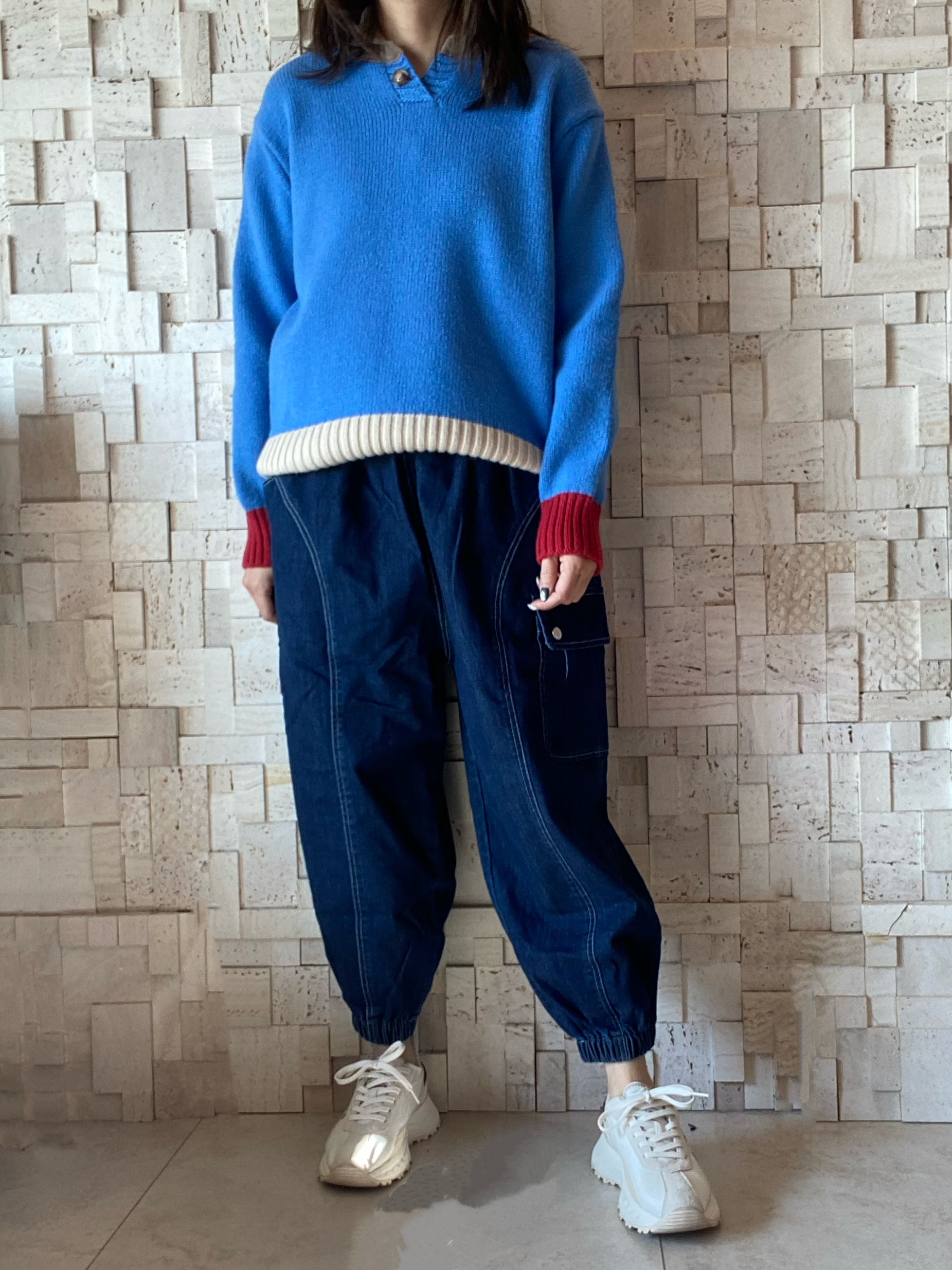#2038 Polo領撞色針織線Top